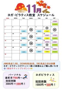 【スケジュール】11月のスケジュールを更新しました! いつも当店をご利用いただき、誠にありがとうございます。 ヨガピラティスの11月のレッスンスケジュールです! 寒さも少しずつ厳しくなり、本格的に秋の訪れを感じる・・・そんな季節になってきましたね。 体調を崩しやすい時期でもありますので、ヨガ・ピラティスで体を温めて年末に備えましょう! ご来店お待ちしております。
